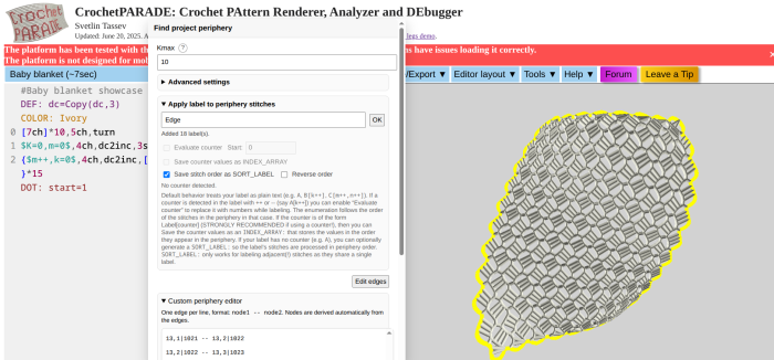 So this update is about giving CrochetPARADE a real periphery workflow: find it, visualize it, edit it when needed, and then label it in a way that makes it easy to work stitches in the periphery, and in a way that stays stable even as you keep editing/refactoring the project. (Which is the whole point of CrochetPARADE’s “precise text → 3D model workflow.)